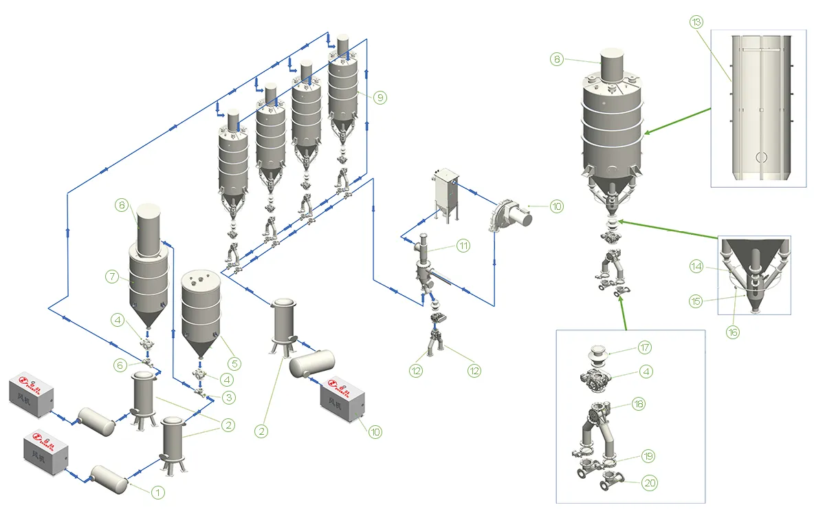 این سیستم تخلیه کانتینر که برای تخلیه مواد جامد فله با ظرفیت بالا طراحی شده است، مجهز به نقالههای پنوماتیک و مکانیزم بالابر هیدرولیکی است تا تخلیه سریع و کارآمد از کانتینرها یا کامیونهای مخزن را امکانپذیر کند. این سیستم از ظرفیت تخلیه 50 تا 200 تن در ساعت با میزان باقیمانده مواد کمتر از 0.3٪ پشتیبانی میکند. این سیستم به طور قابل توجهی راندمان چرخش لجستیک را بهبود میبخشد و در عین حال انتقال کامل مواد و حداقل ضایعات را تضمین میکند.