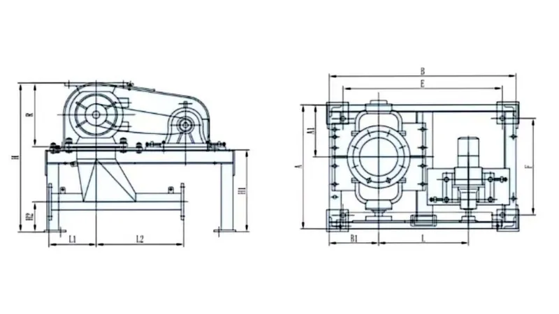 | مدا | موتور محرک (کیلووات) | ظرفیت روتور (لیتر/دور) | L1 | L2 | B1 | H0 | n-Ød1 | H | H1 | ØK | وزن (کیلوگرم) |